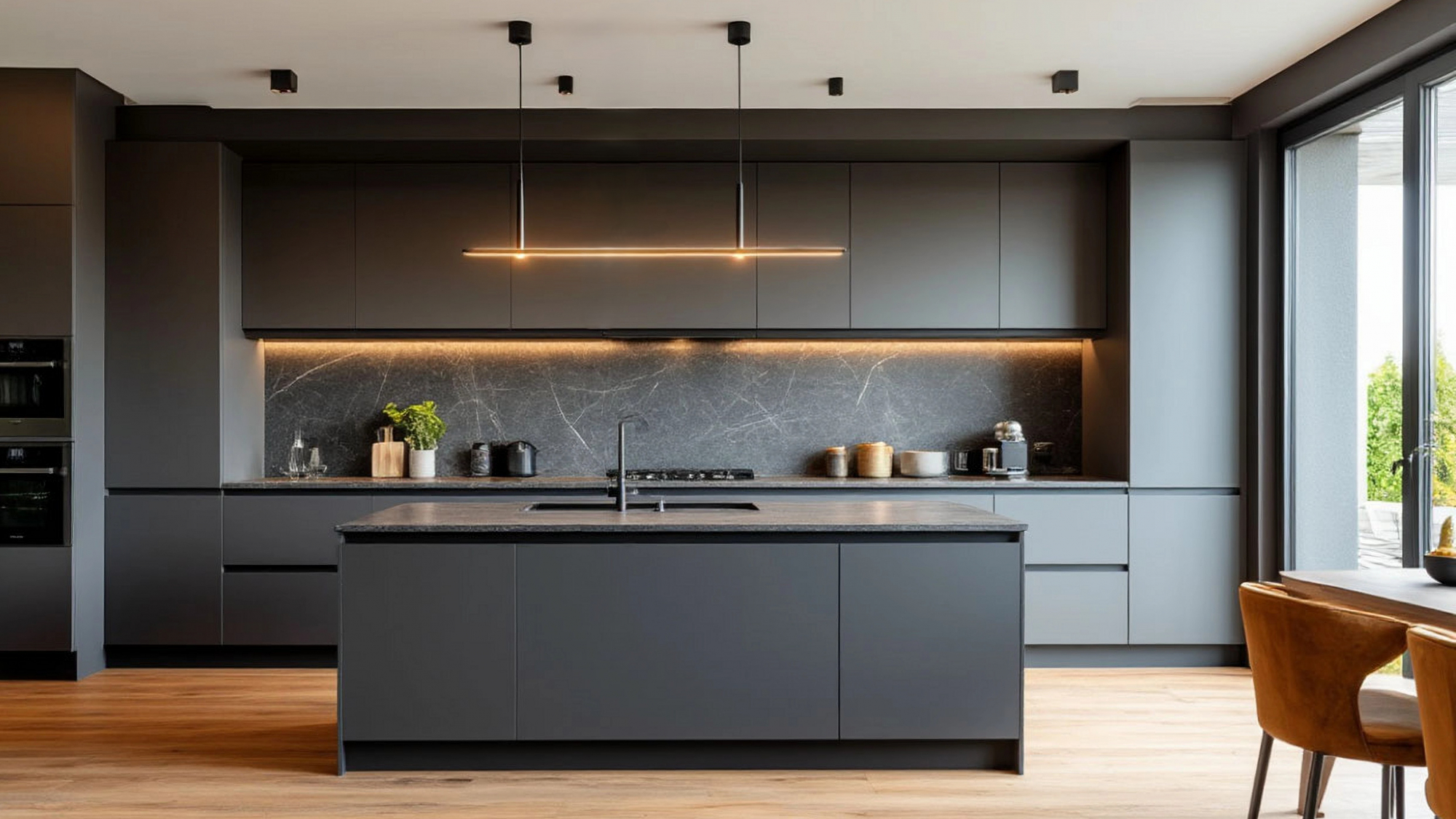 Особенность модели "Графит" заключается в том, что она изначально проектировалась как универсальное решение для разных типов помещений, но при этом сохранила свой ярко выраженный характер. Глубокий серый оттенок воплощает спокойствие и основательность, не перетягивая на себя внимание, а подчеркивая все, что находится рядом — от натурального дерева до теплого рассеянного света. Матовая поверхность фасадов создаёт мягкую игру полутонов, которая делает кухню визуально более объемной, а светлая или контрастная отделка стен позволяет добиться именно того настроения, которое нужно владельцу: строгого и минималистичного, уютного и домашнего или почти футуристичного. Кухня "Графит" легко подстраивается под любое прочтение современного дизайна, но всегда оставляет за собой ощущение основательности и технологичности.