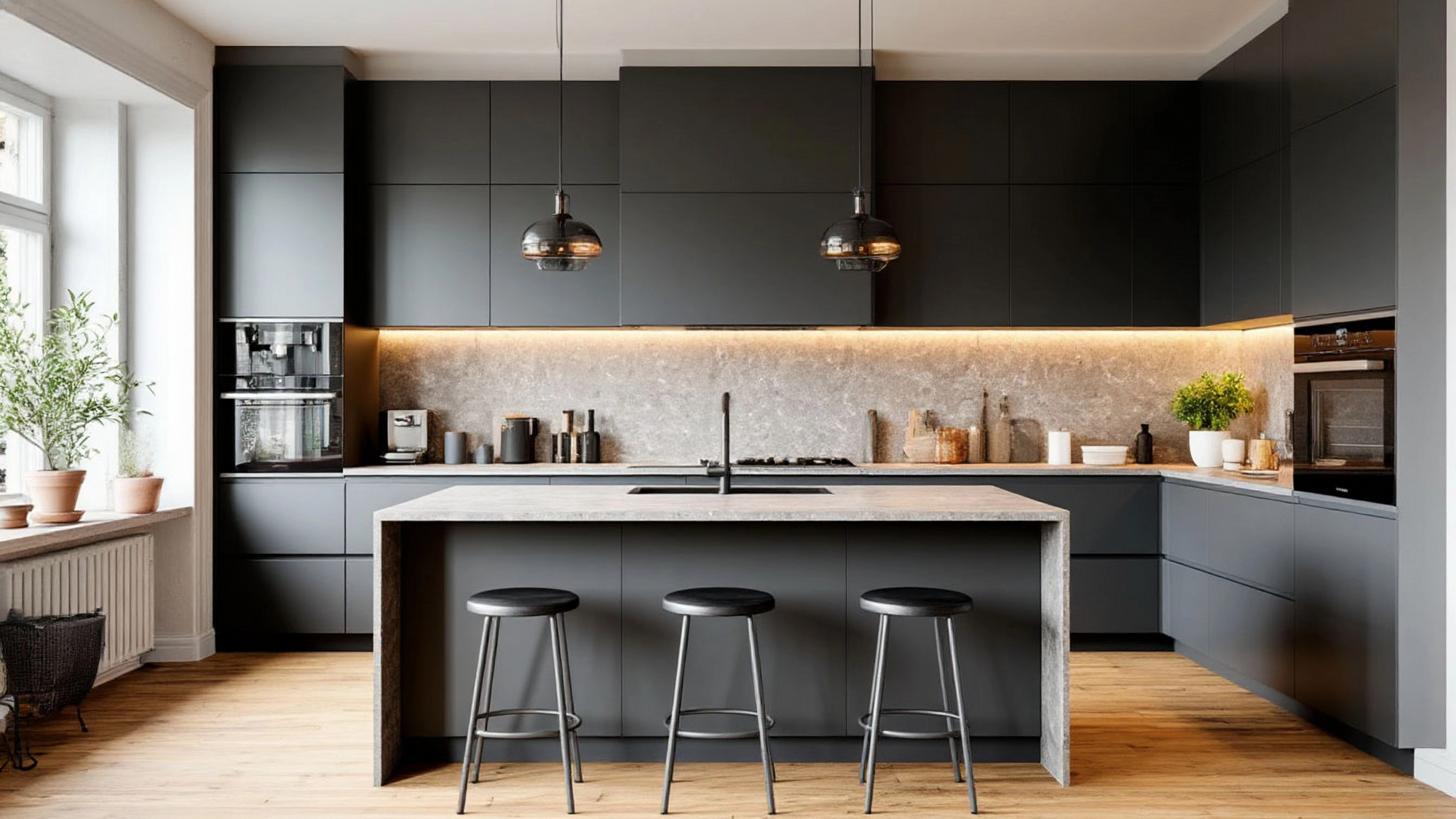 "Грейлинг" легко дополняется декоративными элементами — это ещё одно её преимущество. Серый фасад прекрасно сочетается с белыми стенами, чёрной фурнитурой, латунными вставками или деревянными поверхностями. Можно добавить акцентную стену с кирпичной кладкой, если хочется больше индустриальности, или наоборот — вплести в интерьер мягкие ткани, керамику и зелень, если важнее уют.