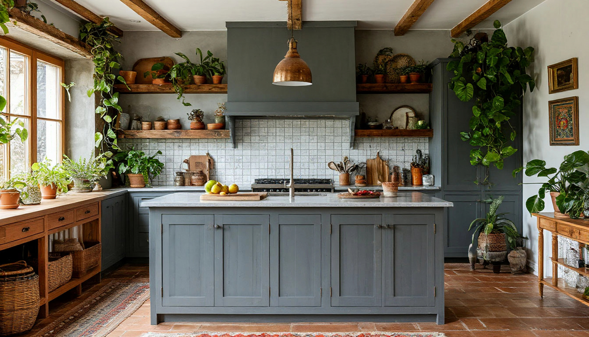 Важная часть атмосферы — это мебельная фактура. Серый цвет фасадов напоминает отполированный временем камень или пепельный лен, он тёплый и благородный. А деревянные элементы добавляют естественности и душевности, словно переносят в дом, где всегда пахнет хлебом и свежими травами. Здесь легко сочетаются старое и новое — как и в истинной философии бохо. Современные решения хранения соседствуют с элементами ручной работы, лаконичные линии — с мягкими, уютными деталями. Всё это создаёт ощущение комфорта, будто кухня существует вне времени.