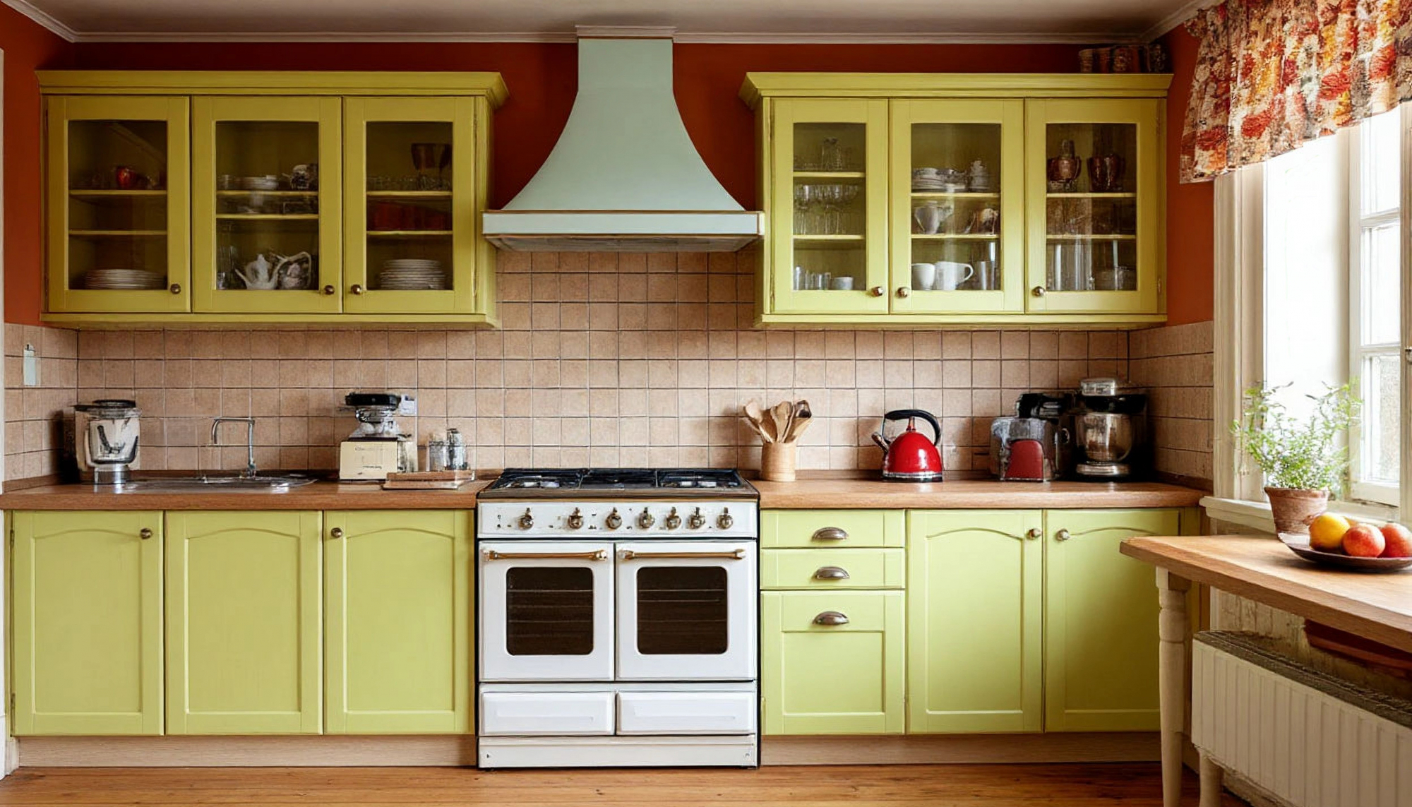 Навесные шкафы не доминируют над пространством. Они не создают эффекта давления и не «нависают» над рабочей зоной. Их линии повторяют мягкую пластику фасадов, что поддерживает общую эстетику ретро. Визуально они выглядят лёгкими, особенно за счёт светлого оттенка и аккуратных пропорций. Это особенно важно для небольших кухонь, где каждый сантиметр имеет значение.