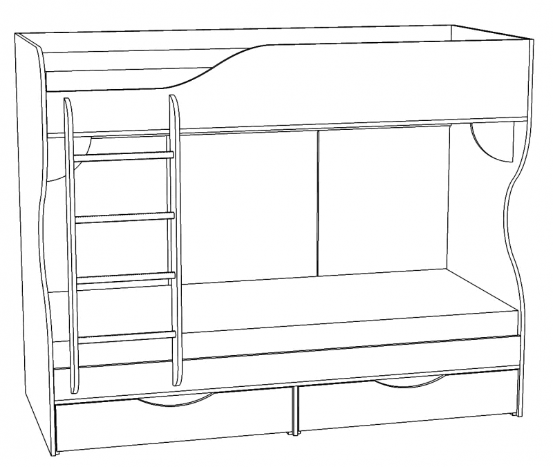 Особенности модели: Головной и ножной щиты, а также детали кровати, которые в эксплуатации подвержены механическим повреждениям, облицованы кромкой ПВХ толщиной 2 мм. Спальное место 2000*800 мм. Основание щитовое, в основании установлены два ящика на опорах колёсных для хранения постельного белья. Расстояние между верхним и нижним ярусами 860 мм.