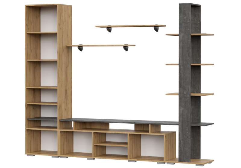 Эта стенка сочетает в себе современный дизайн и практичность. Часть стенки выполнена в красивом оттенке дуба золотого, который добавляет теплоты и света в интерьер, а другая часть в темном камне создает контраст и придаёт массивности. Открытые полки идеально подойдут для размещения книг, декоративных элементов или семейных фотографий, а закрытые шкафчики помогут скрыть лишние вещи и поддерживать порядок.