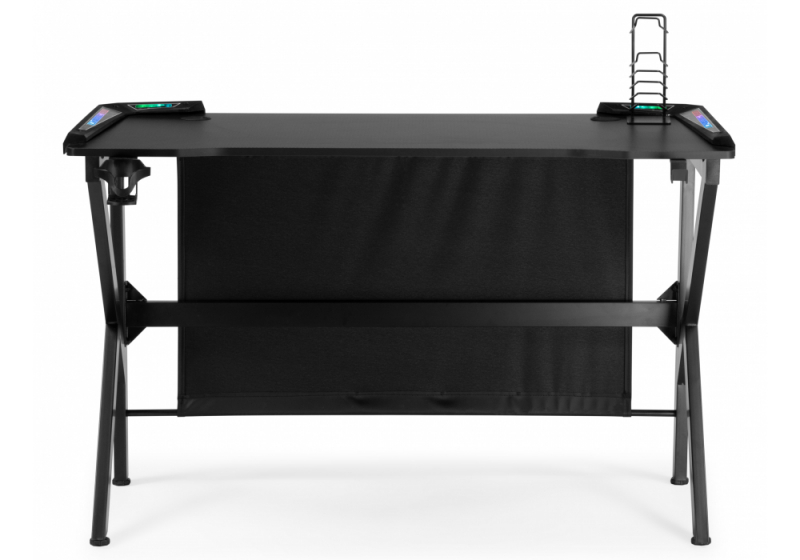 Поверхность столешницы покрыта пленкой под карбон. Стол оснащен подстаканником, крючком для наушников и универсальным держателем. Толщина столешницы: 2 см. Диаметр подстаканника: 9,5 см. Глубин подстаканника: 5,5 см.