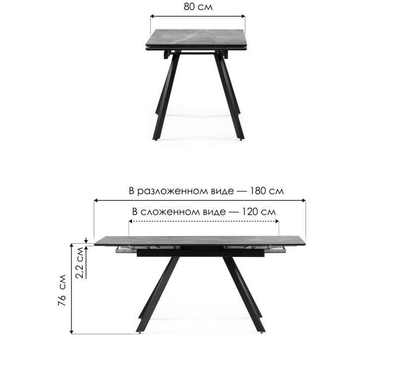 Обеденный стол Габбро 120(180)х80х76 серый мрамор / черный (80x76).