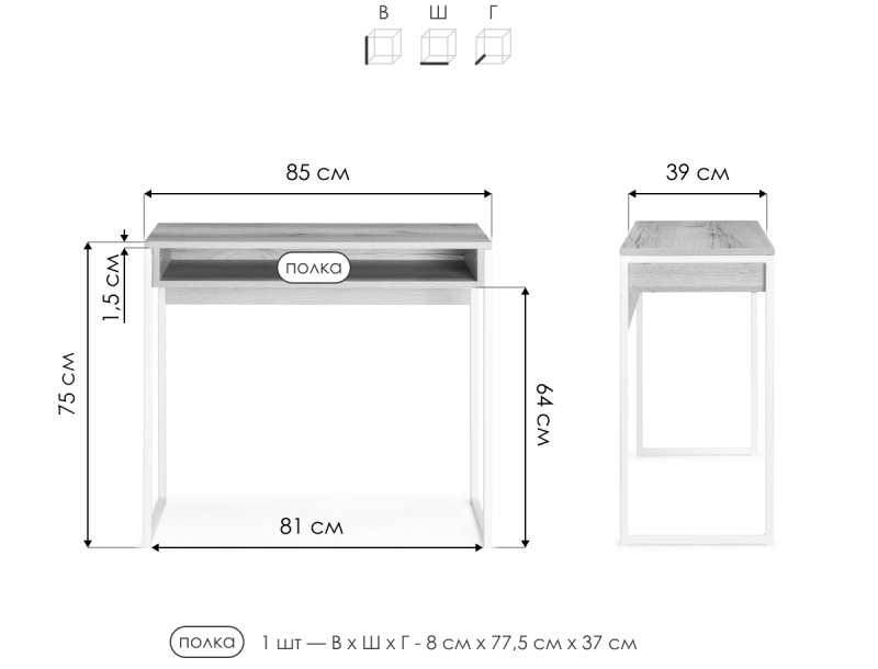 Расстояние между ножек: 81 см. Высота до полки: 64 см. Размер одной полки (Ш х Г х В): 77,5 х 37 х 8 см. Толщина столешницы: 1,5 см.