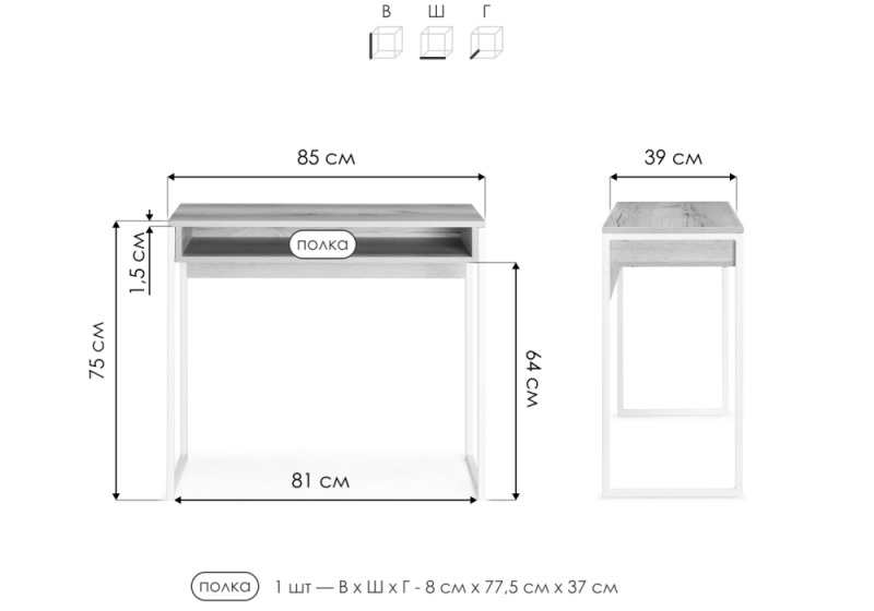 Расстояние между ножек: 81 см. Высота до полки: 64 см. Размер одной полки (Ш х Г х В): 77,5 х 37 х 8 см. Толщина столешницы: 1,5 см.