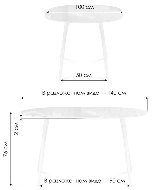 Расстояние между ножками: 90 х 50 см. Толщина столешницы: 2 см. Толщина МДФ под стеклом: 1,6 см. Толщина стекла: 0,4 см.