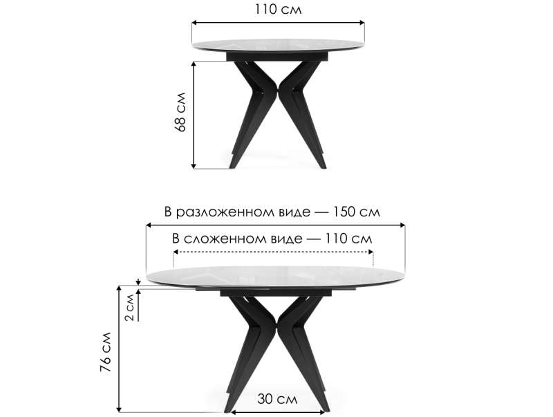 Толщина столешницы: 2 см. Расстояние между ножками: 30 см.