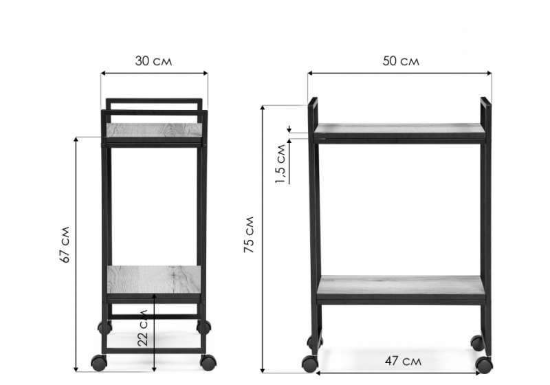 Толщина столешницы - 1,5 см. Расстояние до нижней полки - 22 см. Расстояние до верхней полки - 67 см. Расстояние между ножками - 47 см.