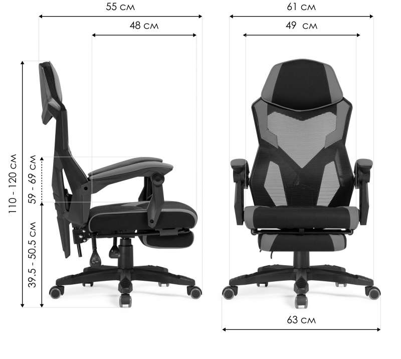 Высота подлокотников: 59 - 69 см. Высота спинки: 70 см. Диаметр крестовины: 63 см.