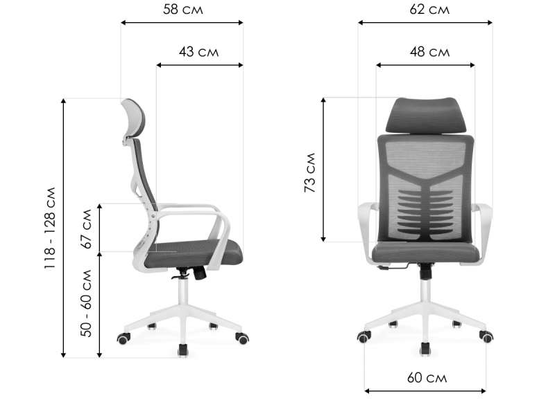 Высота подлокотников: 73 см. Диаметр крестовины: 60 см.