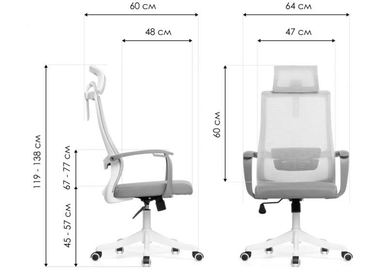 Высота подлокотников: 67-77 см. Диаметр крестовины: 60 см.