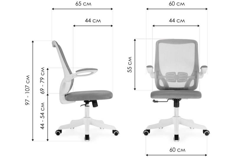 Высота подлокотников: 69 - 79 см. Диаметр крестовины: 60 см.