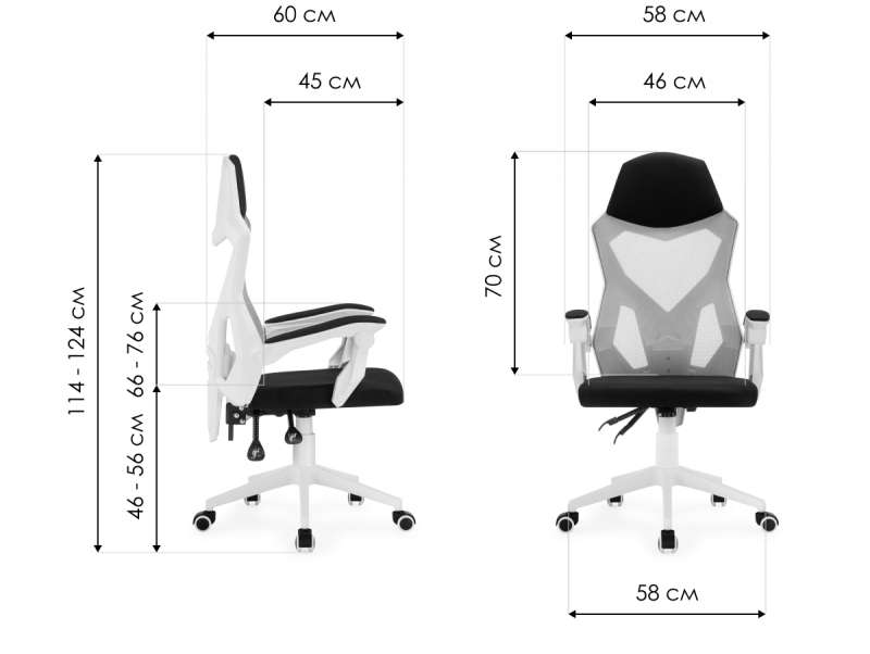 Высота подлокотников: 66 - 76 см. Диаметр крестовины: 58 см.