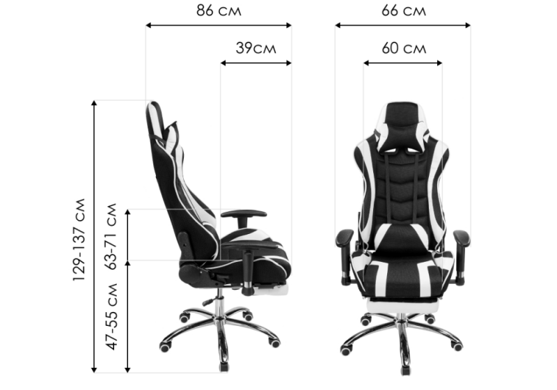 Высота подлокотников: 63 - 71 см. Подлокотники дополнительно регулируются по высоте на 4 см. Глубина кресла с вытянутой подножкой: 105 см. Глубина сиденья без подушки: 47 см.